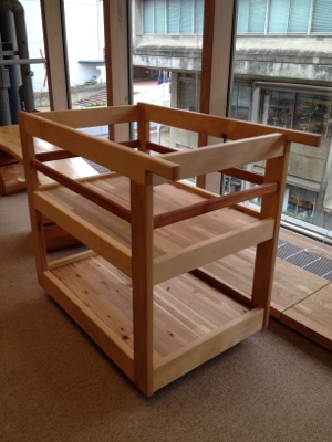 コンパクトなベビーベッドは下部に荷台もあり場所をとりません。またいずれはキッチンワゴンとして使える大きさです。従来のベビーベッドより小さくキャスター付きで移動も可能!