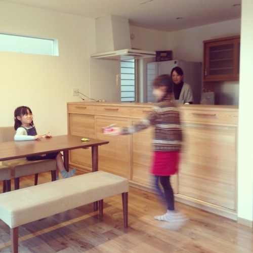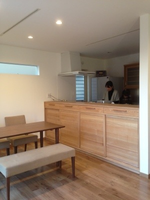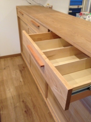 キッチンとダイニングを程よく遮り、かつ収納と木の柔らかな雰囲気を。引出しは普段、テーブルの上に置きそうな日用品やカトラリー。下段には食器はもちろん、本から教科書まで。ランドセルやお稽古道具も入るでしょう。