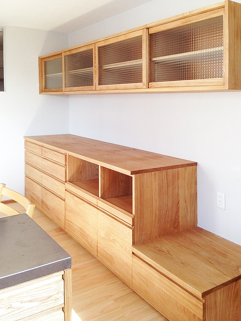 引き出し、スライド棚、吊り棚と壁面に充実したカップボードが完成です!お持ちの家電にあわせて引き出し、棚内に収まるように設計し、オーブンは端の低い段に設置。カウンターの高さと合うようになっております。吊り棚のガラスは中が見え隠れする感じで機能的でさらに雰囲気もアップしますね!