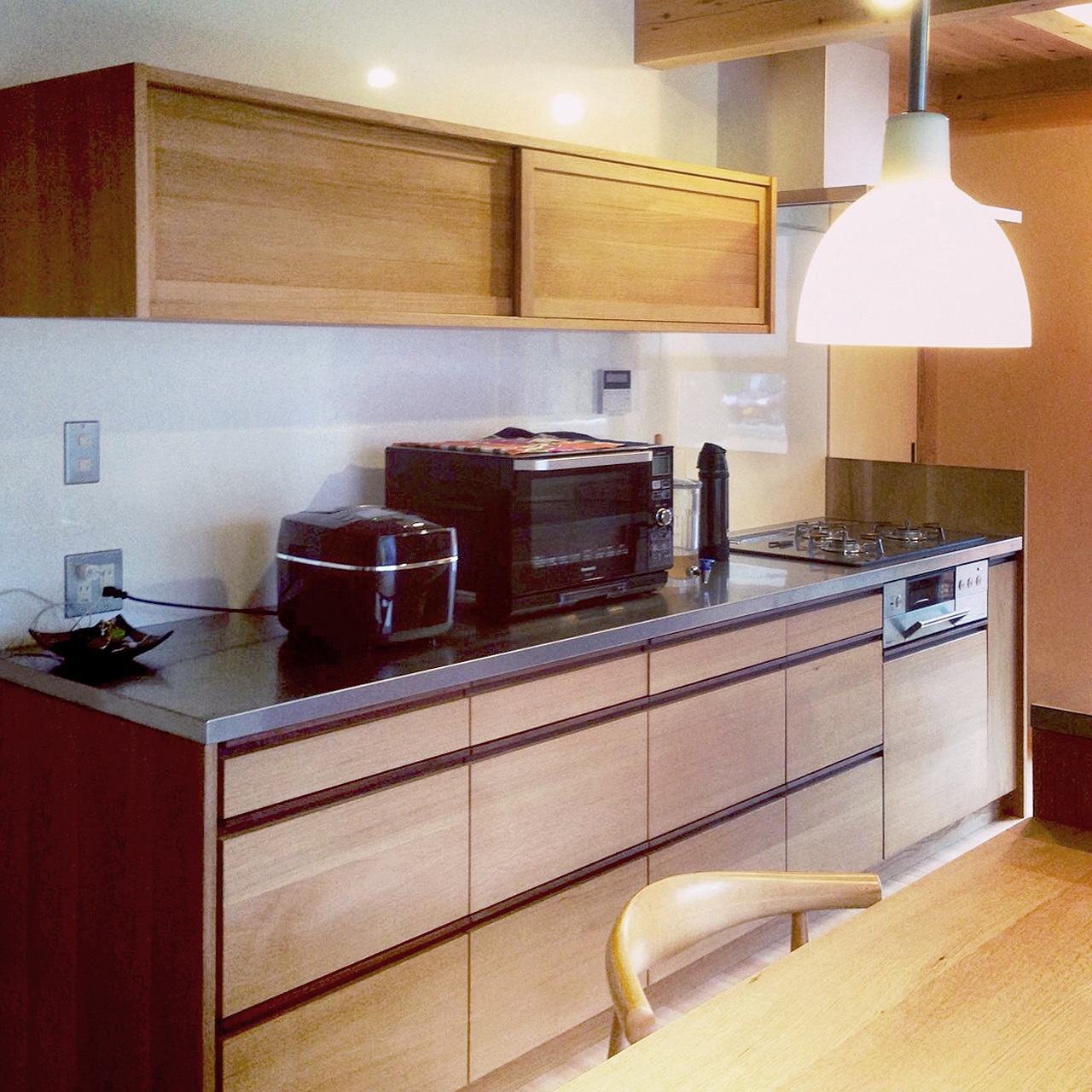 ステンレスと無垢材。これしか使ってません。連続する引き出し、色の違う木製引手。機能を考え、細部に少し手を加えればシンプでも存在感のある家具になります。潔くて好きです。これ。飽きが来ない形。