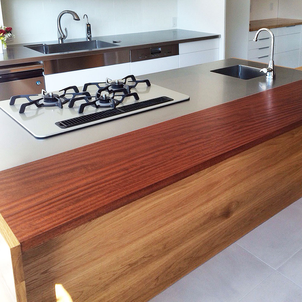 ようやく完成が見えてきました。まだ少し作業が残っているので少しだけご紹介。ステンレスとオーク材、赤茶色のサペリ。市販品では買う事の出来ない自由で無駄を省いた形がここにはあります。