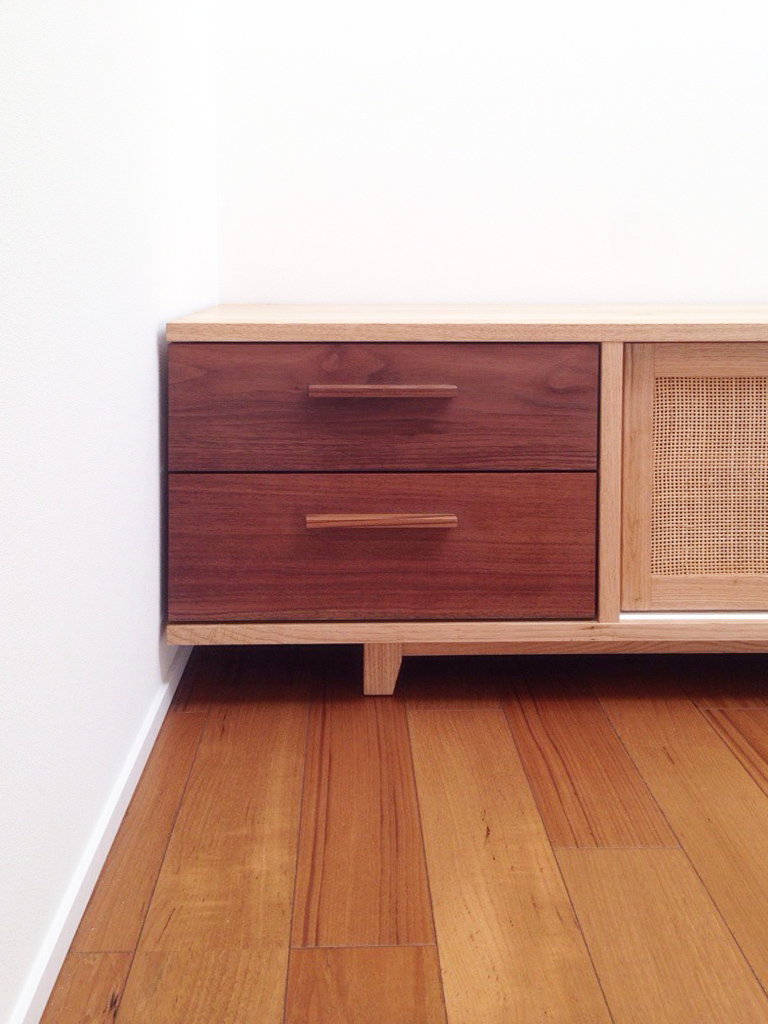 シンプルな空間にはちょっと気の利いた家具を。それでいてさり気なく。栗とチークのテレビボードが完成です。背面が白い壁。白い余白は残して部屋は明るく、絵を飾ったりする可能性も残しましょう。と言う形。扉は藤なのでリモコンのセンサーを通すことができます。