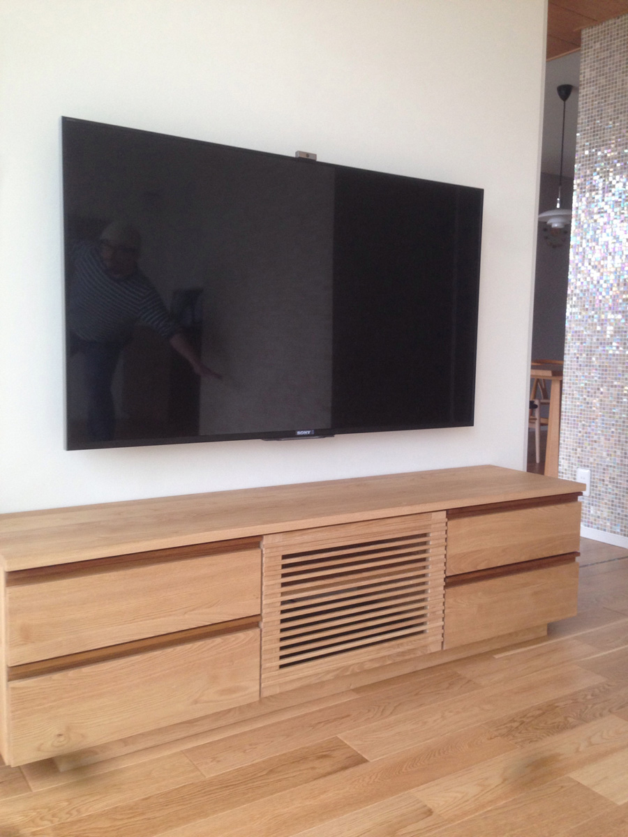 打ち合わせの時は白壁と壁掛けTV。そこで思うわけです。この壁に1番のサイズと機能はと何だ?と。床はオーク、奥にもチラリ見えるoguma家具。ものづくりにルールはありませんがこれがogumaの答えです。材料は栗とチーク。CD、DVDをピシッと収納できるように。