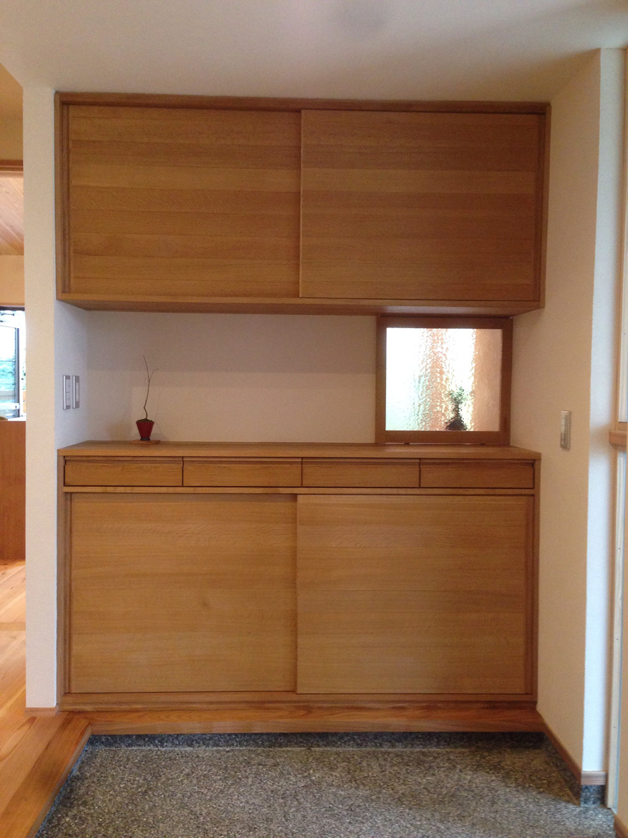 これまた素晴らしい玄関収納が!自画自賛で申し訳ございません。この家具は背面側は実は食器棚になっております。このw1800のd950に機能的で空間をさらに上質なものにして欲しいと言うご要望。壁面収納だけど圧迫感もないように、また飾り棚スペースはもちろん設け、気の利いた小引き出しとリビングと玄関を緩く繋げる小窓が効いてます。出勤前の忘れ物もこれで減るかもです。