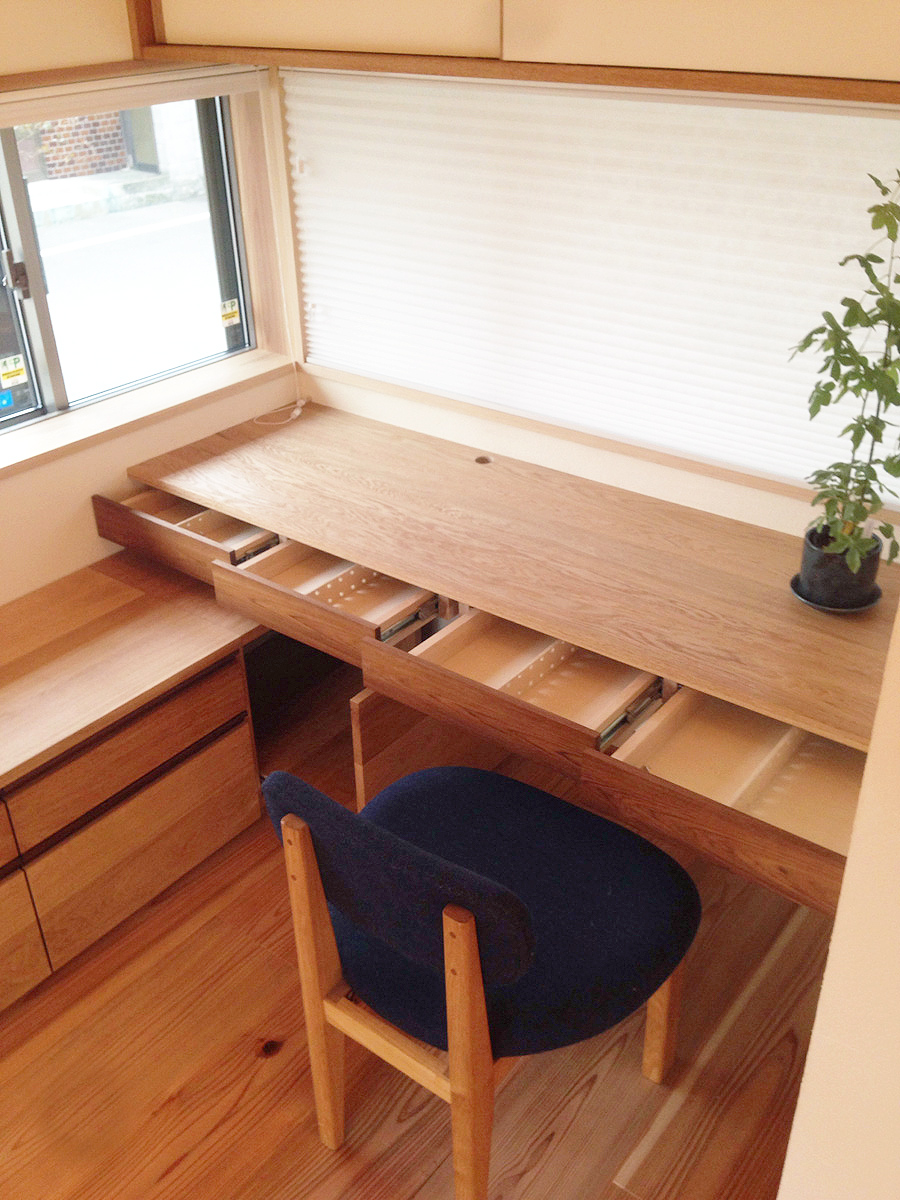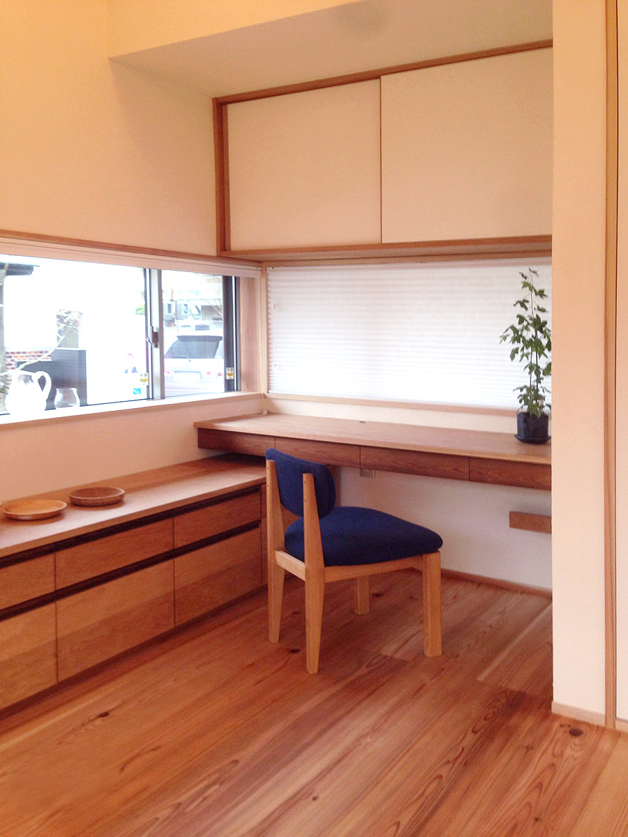 コーナーを上手く利用出来ました。幸いTV台もご依頼頂いたので高さ関係を調整してデスクの下に引き出し、プリンター台など収納も充実です。上部にはA4サイズが入る吊り戸棚を。部屋の隅で落ち着いて作業が出来ます。家事スペースにもなりそうな居場所。