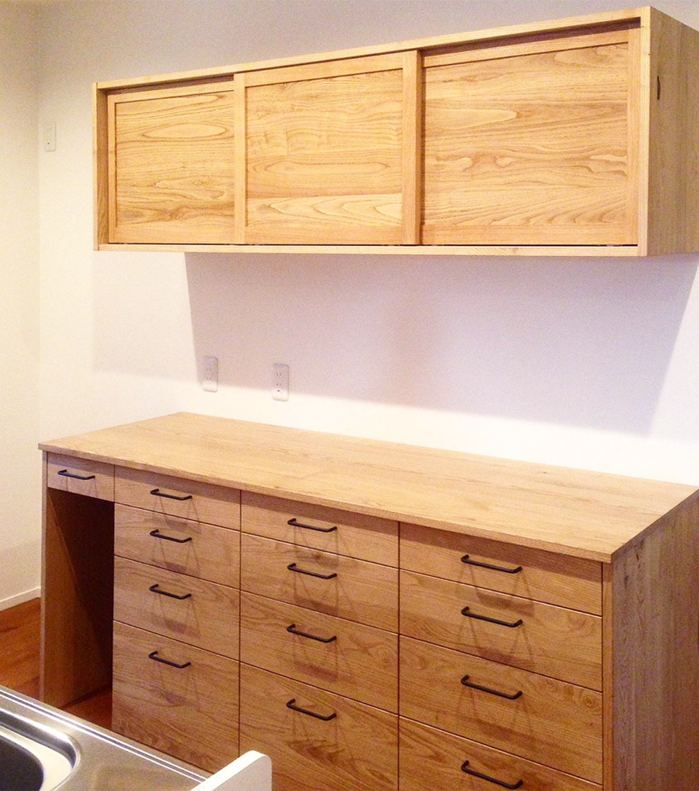 滋賀県の戸建て住宅のお宅へキッチン背面収納のオーダー食器棚を納品しました。家具の木材は栗。栗は使い込むほどに深い色味になりますよ!吊り棚の扉は引き違い戸。カップボードの引き出しは全部で13個!収納力もばっちりです。一番小さい引き出しの下にはゴミ箱をスッキリと収納できます。