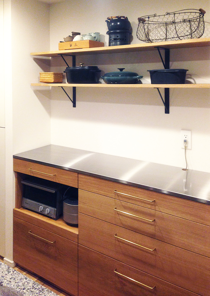 オーク材の食器棚を納品させていただきました。天板はステンレスなので、料理中に水が飛んでも安心です。