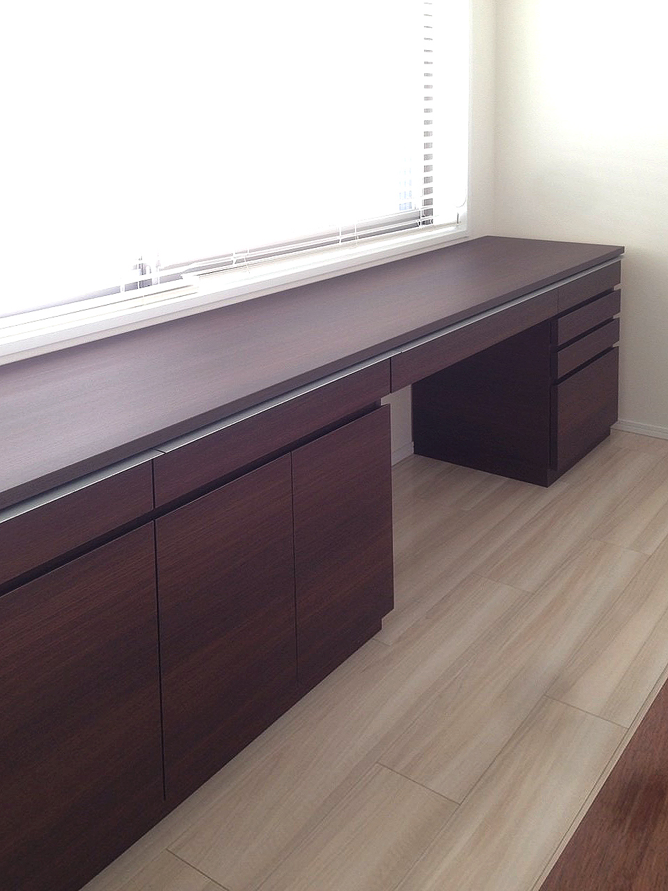 メラミンのウォールナット調のデスク。 クライアント様のワークスペース&リビング収納です。