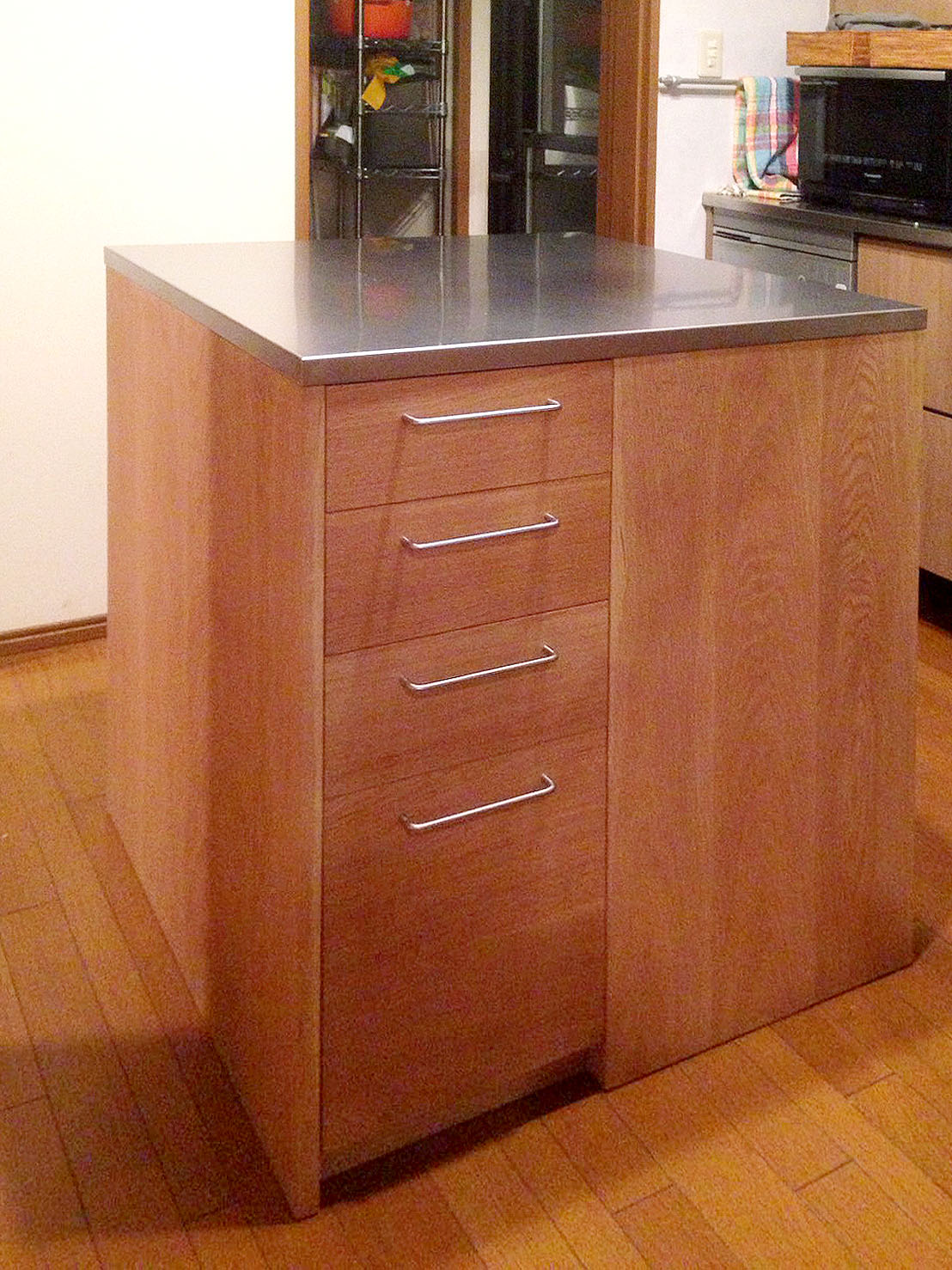 側面のうち3面が収納になっており、3方から使えるカウンターです。 1:引き出し 2:ゴミ箱入れ 3:ブックスタンド となっています。 天板は作業台になるのでステンレスで。