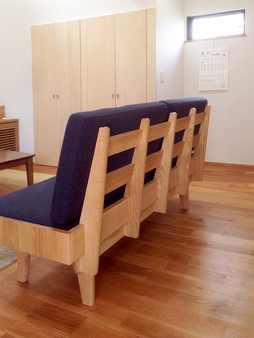 オーダーメイドのソファーです。 木材はオーク材です。 ファブリックは今回はネイビーで。 生地はいろいろな色から選べます。