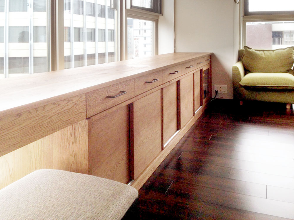 どちらもオーク材で。タワーマンションの天井から床まである窓の前にはなかなか収納を置きづらいですが、このようにぴったりのリビングボードができました。