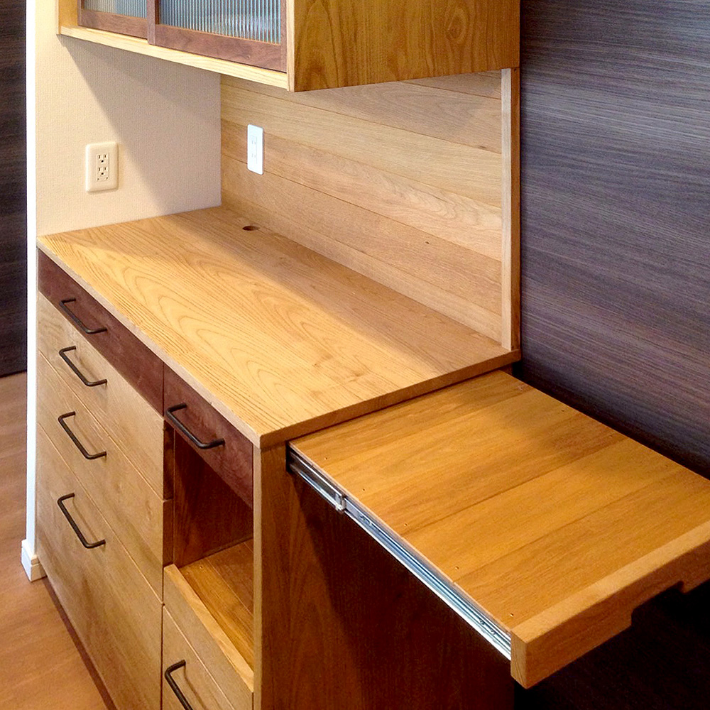 こちらのお宅も2way(キッチンなどに2方向から出入りできる間取り。)の間取りなので、天板には引き出し式の天板を設置。限られたスペースを有効に利用できます。