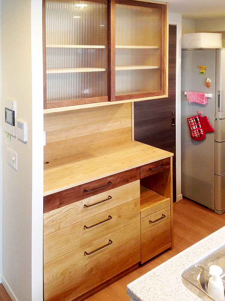 オークとブラックウォールナットの食器棚。大阪のお宅へ納品させていただきました。吊り棚の扉はモール形状のレトロガラスで。ストライプ模様がお洒落です。 カップボードの右上のスペースは炊飯器入れです。