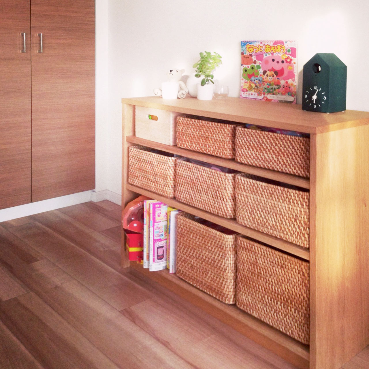 オーク材の棚です。お持ちの小籠箱に合わせて棚の段の高さを設定しました。引き出しを作るとコストが高くなりますが、このようにお持ちの既成の箱を引き出しとして使えば、コストダウンにも繋がります。
