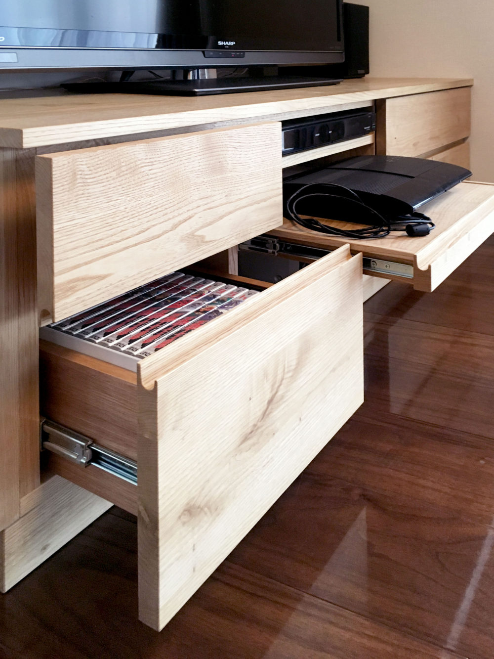 中央のデッキ置き場はスライド式なので使う時には引き出して使えます。 左右の引き出しにもディスクをたっぷり収納可能。