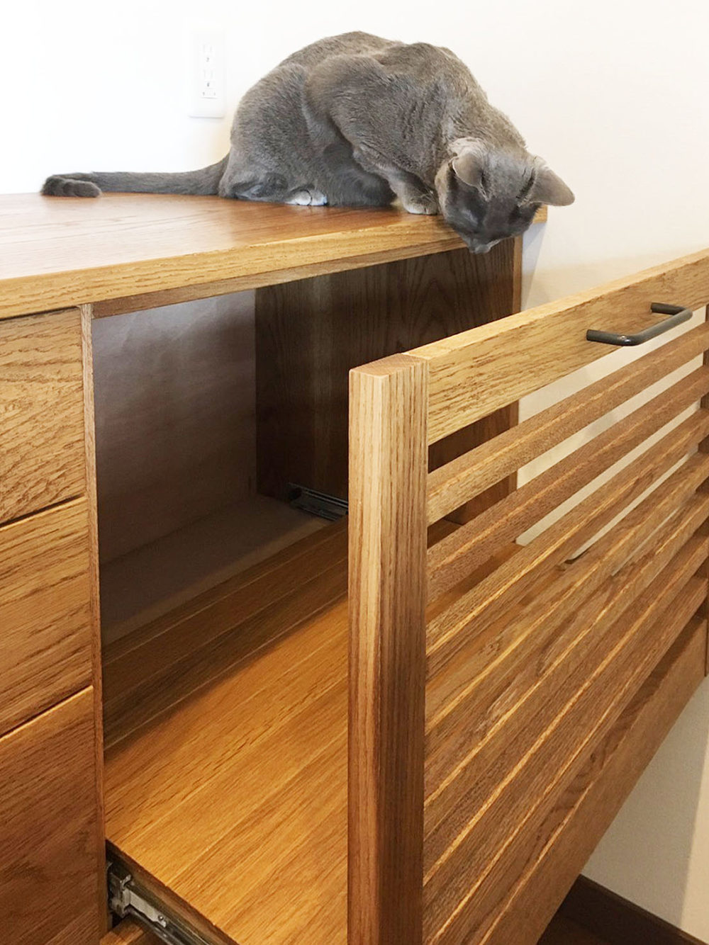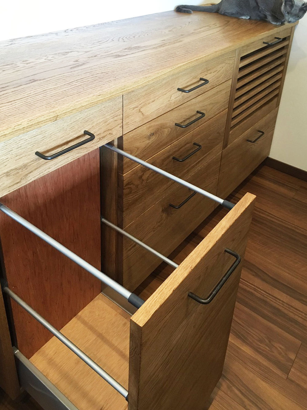 手前にはゴミ袋が引っ掛けられるように、高さのある引き出しを。 奥には家電を隠す格子戸を付けました。
