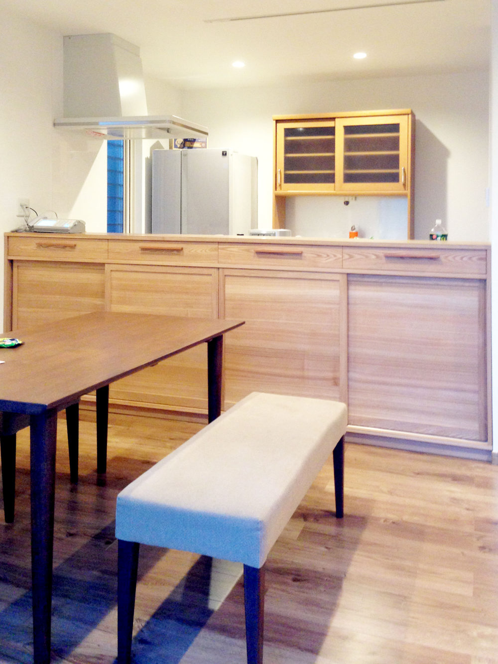 兵庫県宝塚市のお宅のキッチン背面収納。 キッチンとダイニングを木目の柔らかな雰囲気のタモ材で仕切る収納です。 引き出しにはよく使うカトラリーを、下段の収納には食器はもちろん、お子様のランドセルやお稽古道具なども入ります。