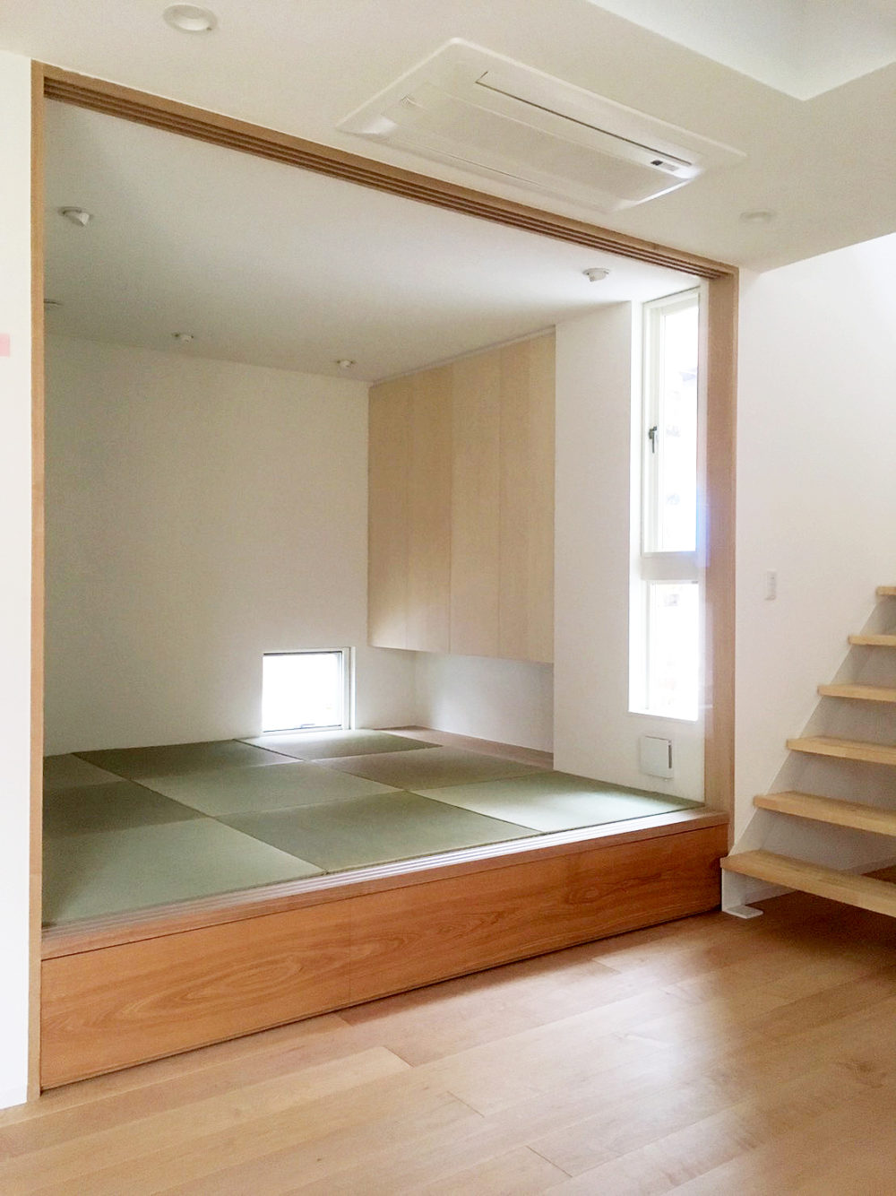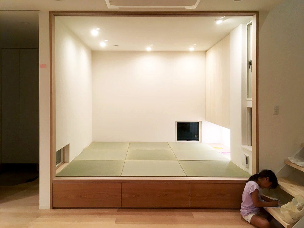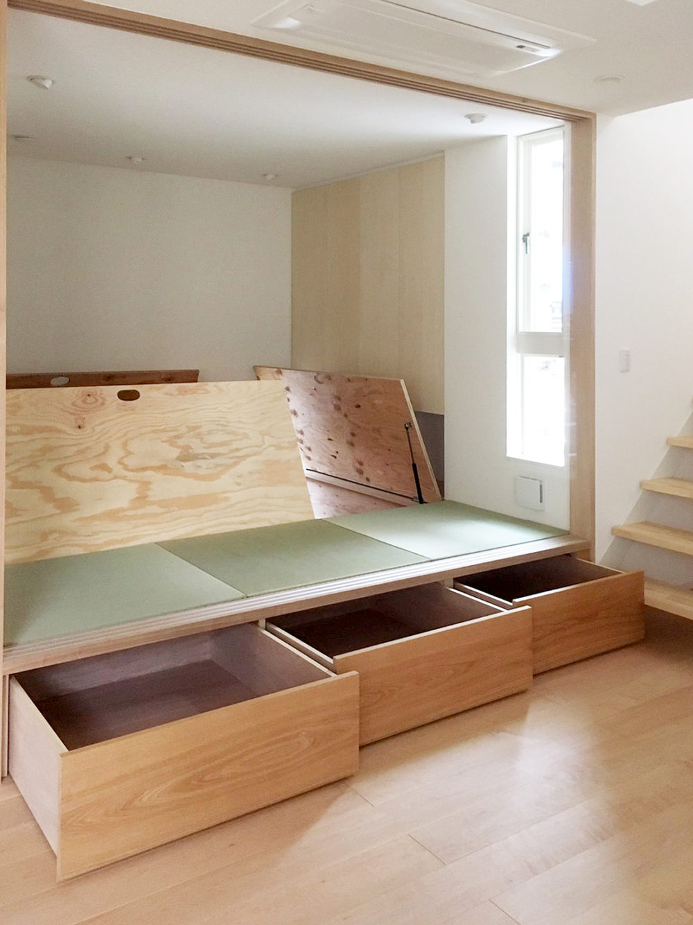 引き出しはもちろん、和室の畳がダンパーで開いて収納に。無駄なく空間を活用。