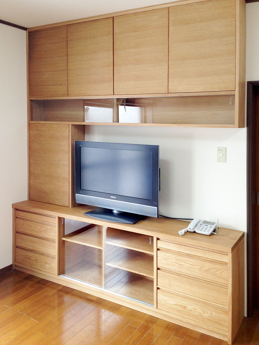 テレビボードと壁面収納。クリアなガラス戸の飾り棚も作りました。