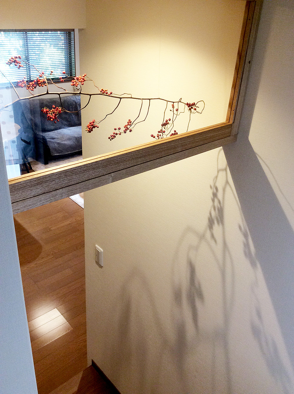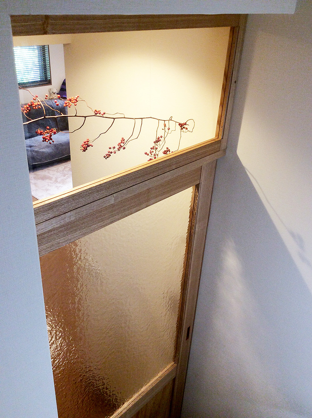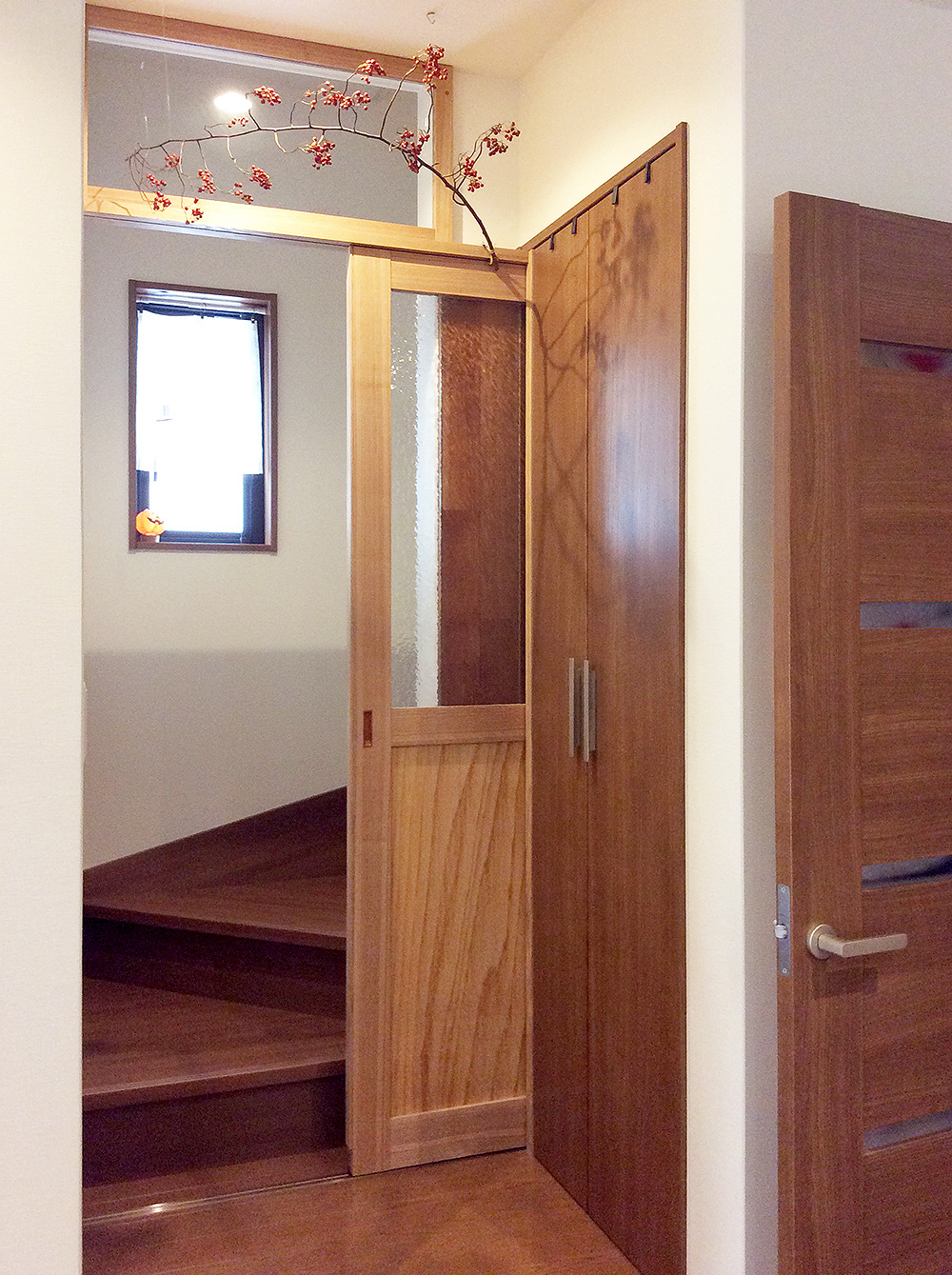ガラス部分に 赤い実の蔓物を飾ってくれたそうです。季節の植物を飾ると家具にも彩りが生まれ、とても素敵ですね。 こちらの案件は、階段に扉がなく、一階の暖気が2階に上がってしまうところ、右の収納を一部巾を狭くして、建具が引き込めるようにしました。