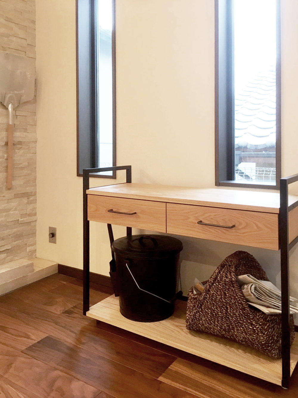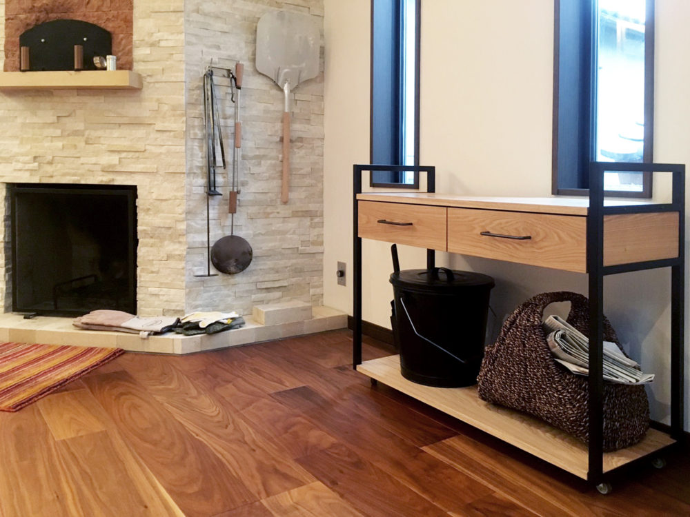 黒いスチールと木材を合わせることで、お部屋の雰囲気に合う家具になりました。下段はオープンなのでカゴやバケツなどを自由に置くことができます。キャスター付きなので移動も楽々。