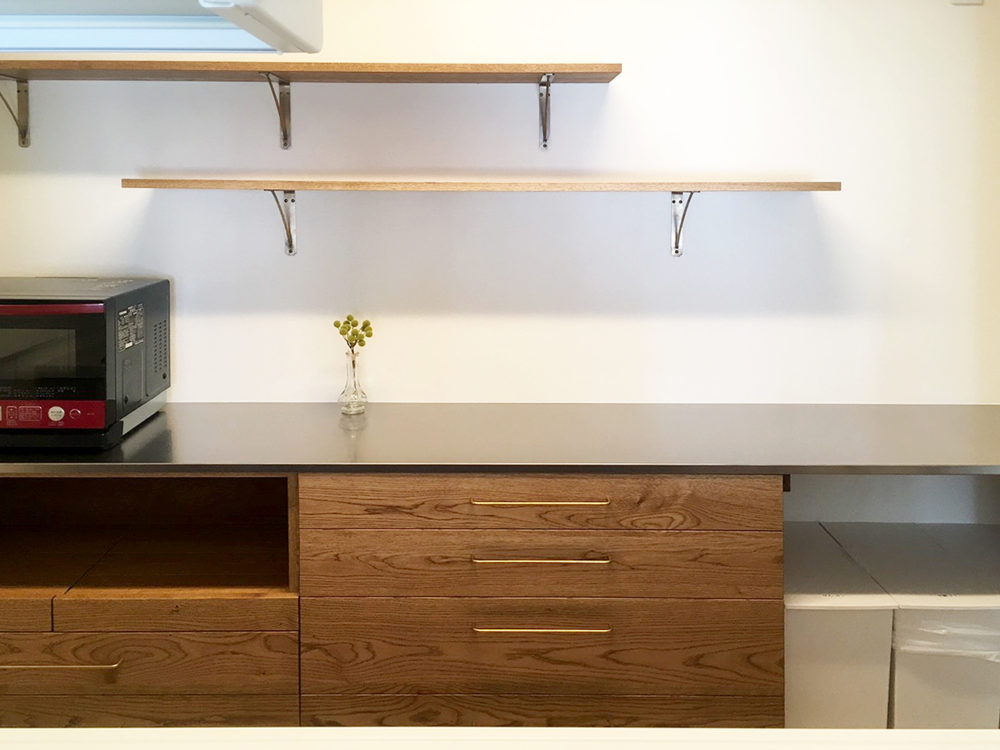 楢に着色しました。棚板は少しずらして配置。ゴミ箱スペースと引き出し付き。天板はステンレスです。