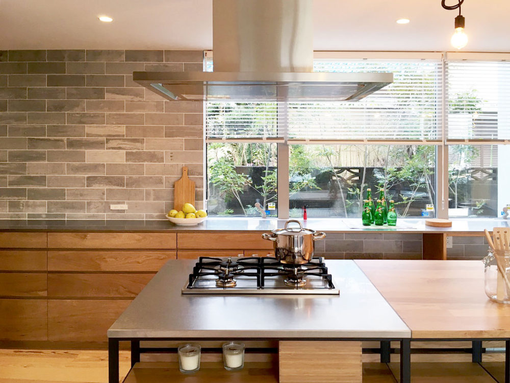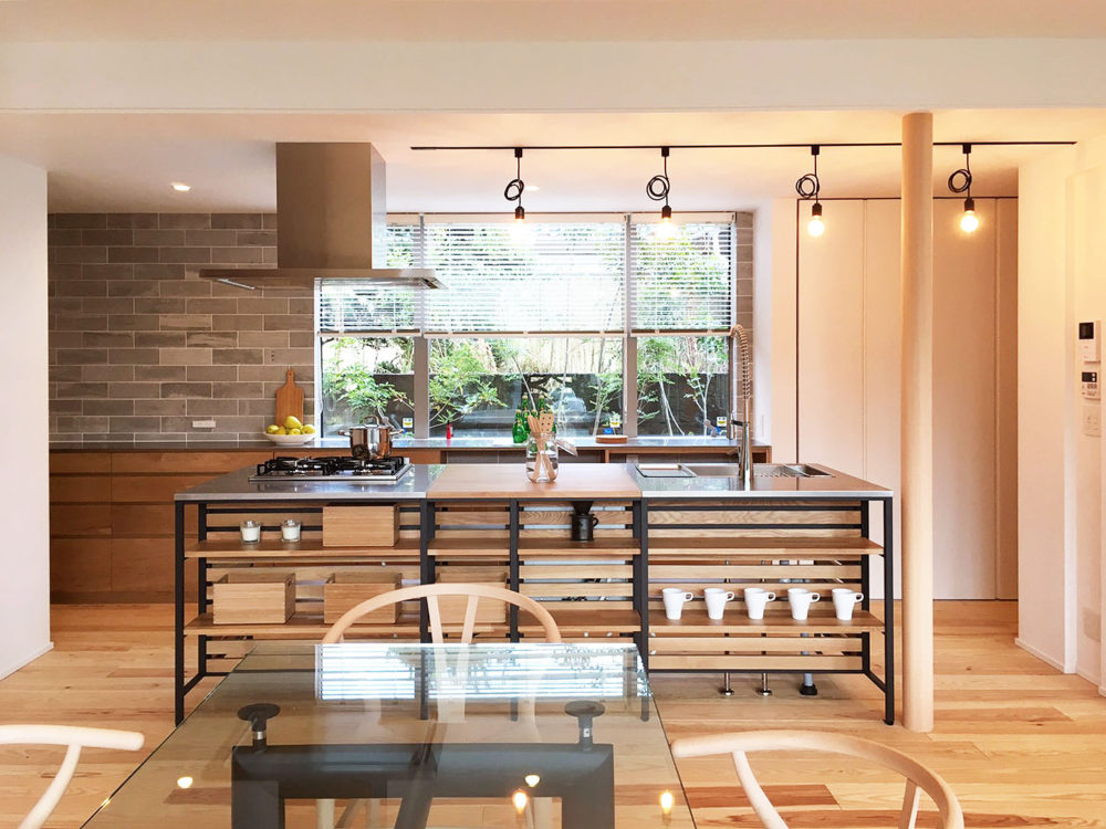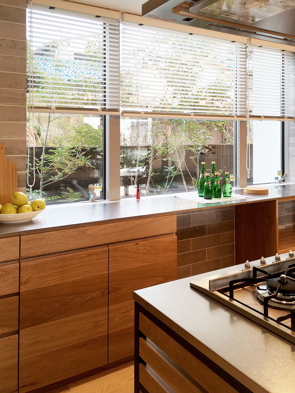 オーク材の食器棚。 5mとワイドなサイズ。 大阪府羽曳野市の設計事務所KADeLさんのショールームへ納品させていただきました。 天板はステンレスですがいつもの食器棚よりも薄くし、シャープな印象に。 窓の外には植栽も見え、とても素敵なショールームです。