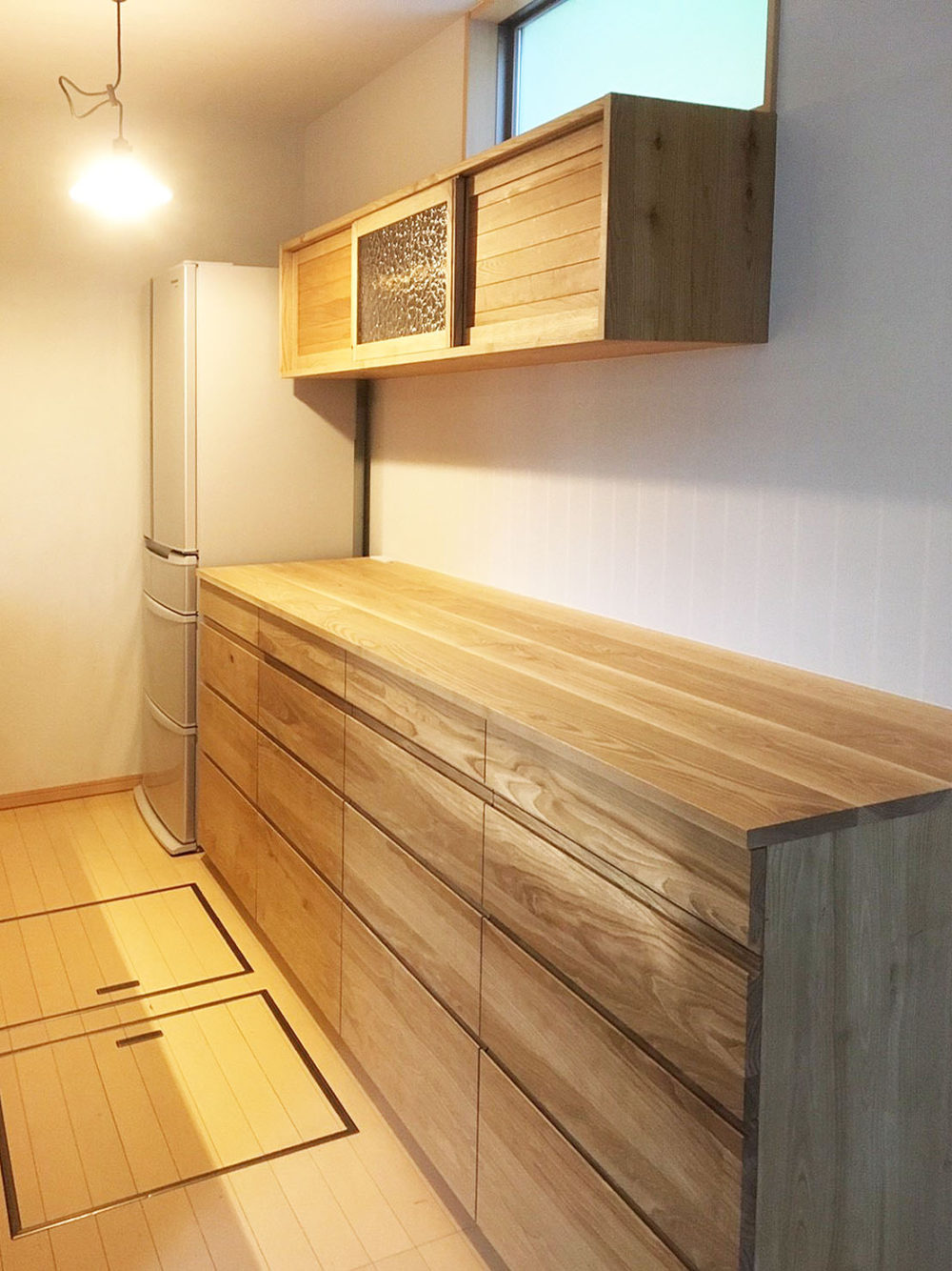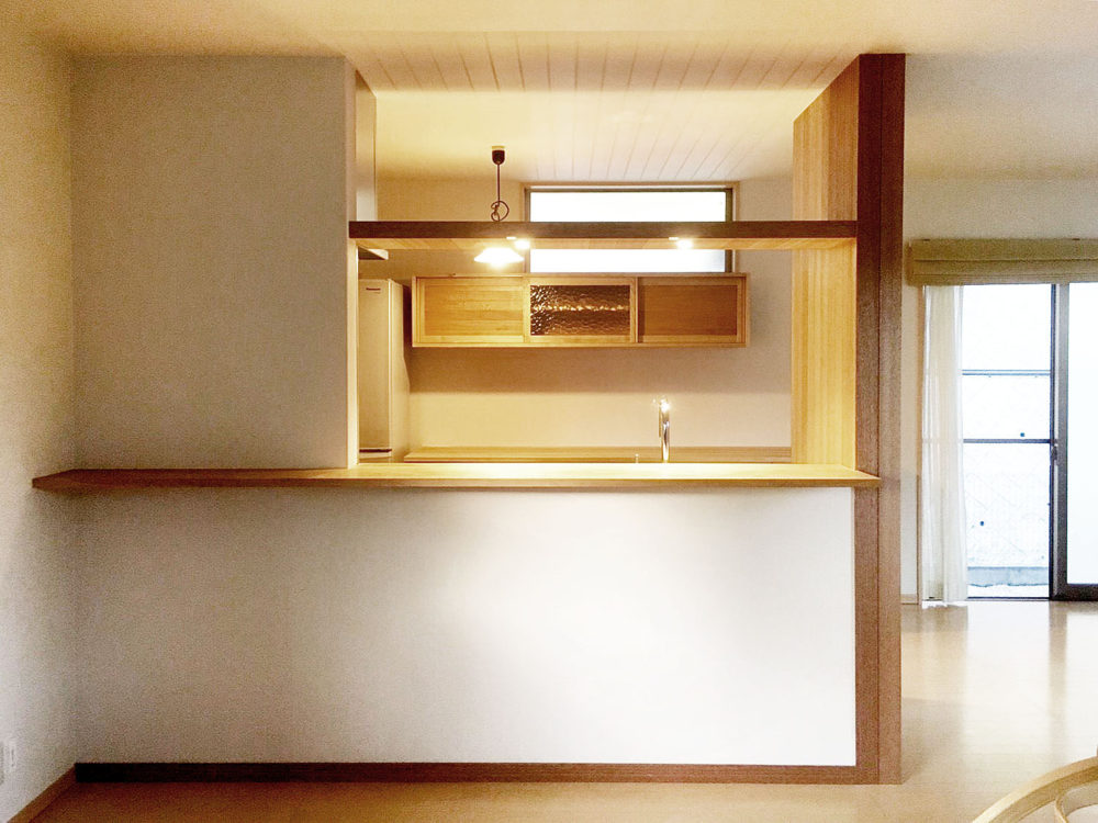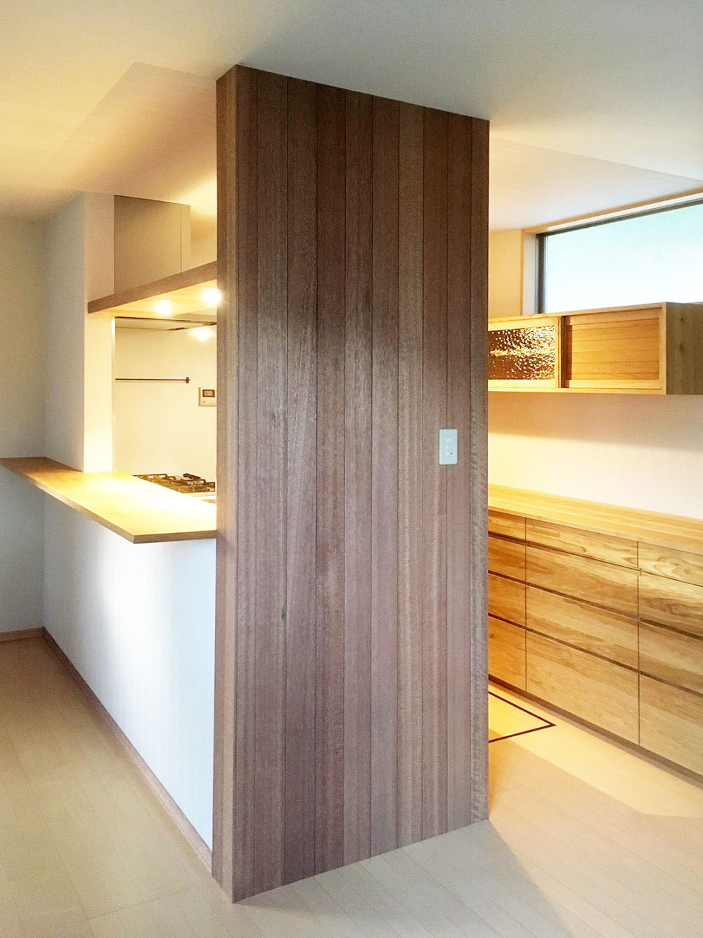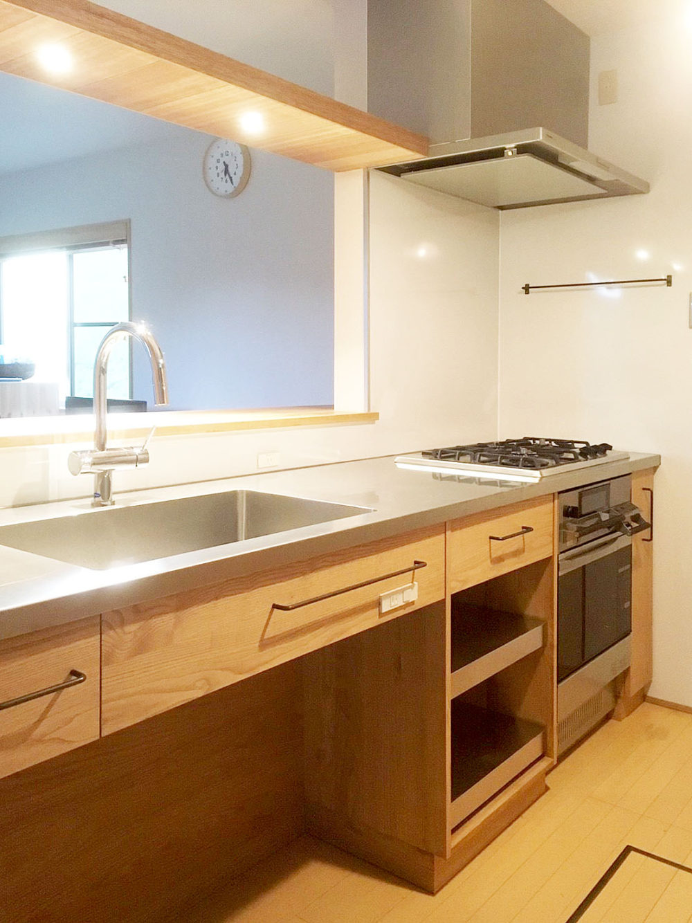 木目の美しい無垢材をふんだんに使った、温かみのあるキッチンに。 シンク上の板に埋め込んだライトが、キッチンを優しく照らします。