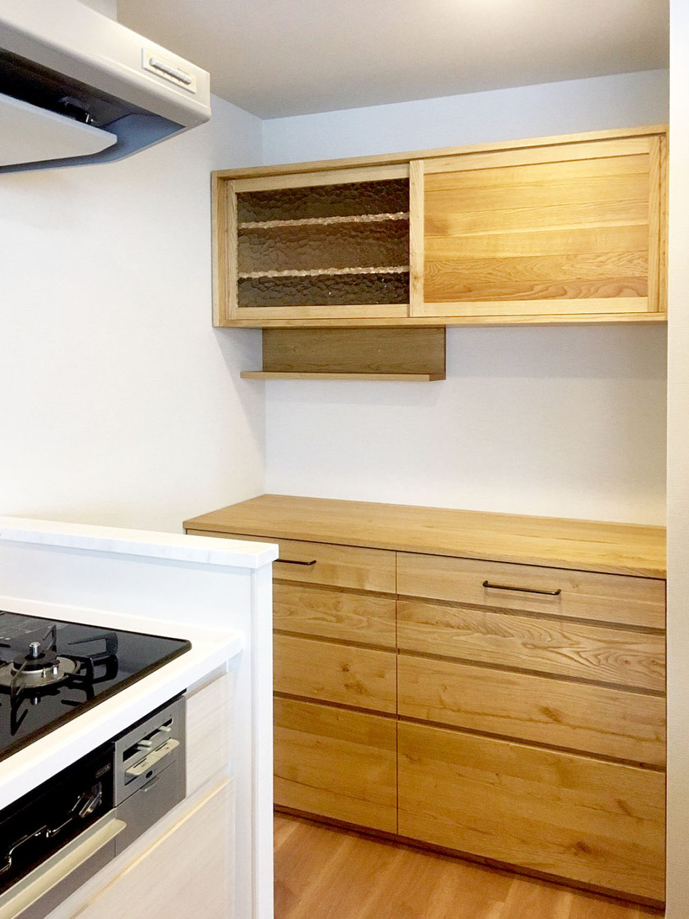 もともとあった食器棚スペースは壁に挟まれており使いづらい間取りでしたが、それを活かしてサイズぴったりのカップボードを設置。