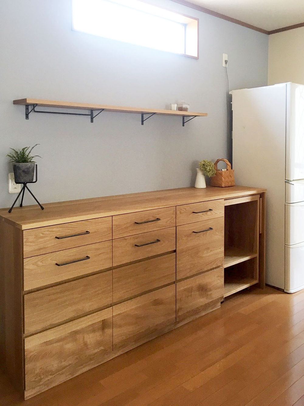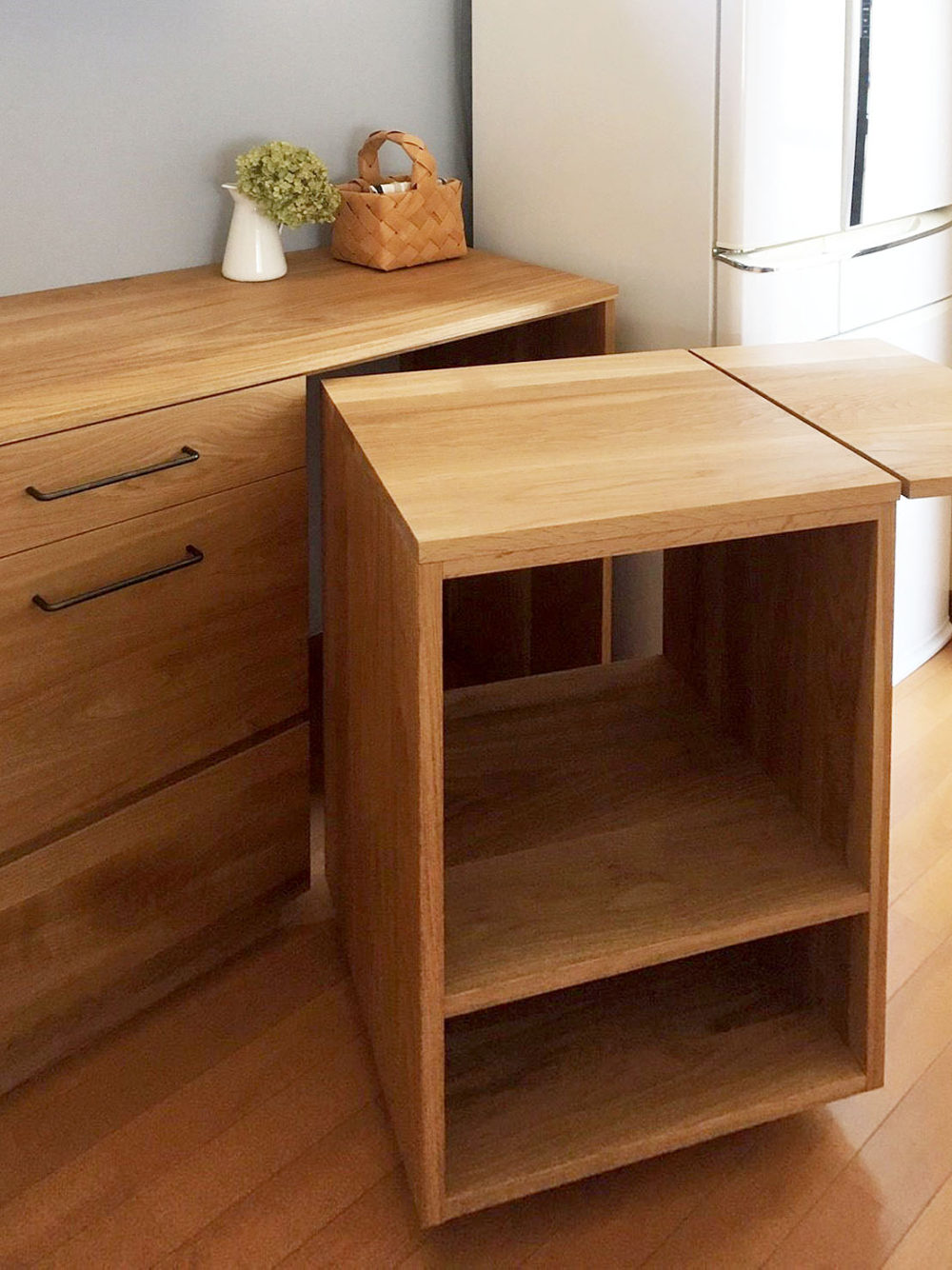 右端にはワゴン付き。(写真2枚目)必要な時に動かして使えるのでとても便利。ワゴンの天板も折りたたみ式なので、作業スペースが広がります。 壁面にはシンプルに一枚板を。