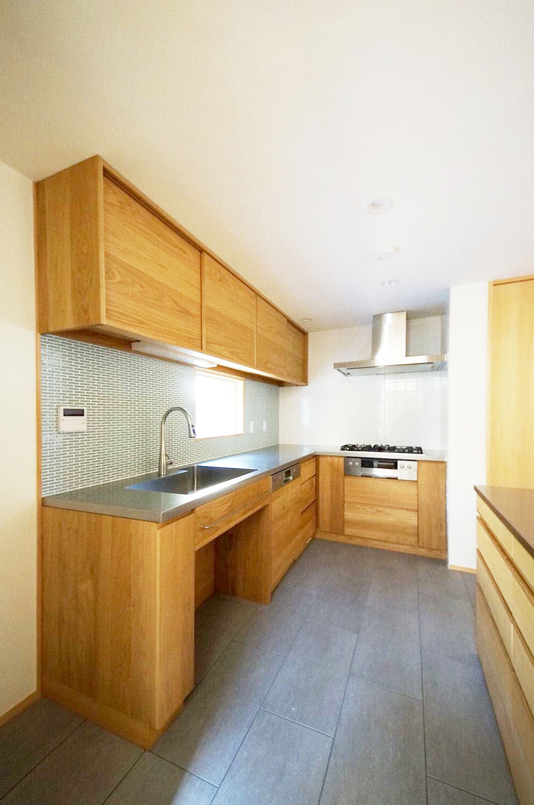 西宮市のお宅のオークのL型キッチン。 無垢材をふんだんに使ったあたたかみのあるキッチンです。