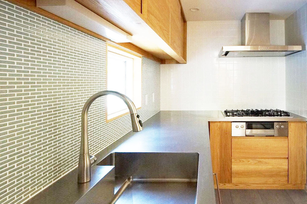 天板はステンレスなので、料理や水仕事でも安心。 収納や食洗機などもすっきりと収めました。