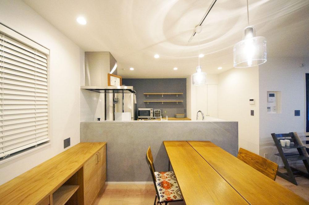 グレーの壁面に、シンプルな飾り棚と下段収納を設置。 素材はオーク材と、引き出しの引き手は真鍮です。 シンプルながらも幅広の引き出しが8個付いているため、食器類もすっきりと収納可能。 ゴミ箱スペースはお持ちのスリムなゴミ箱に合わせて設計。