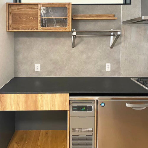 愛知県刈谷市のお宅の栗とステンレスの食器棚。 壁には白いタイ […]