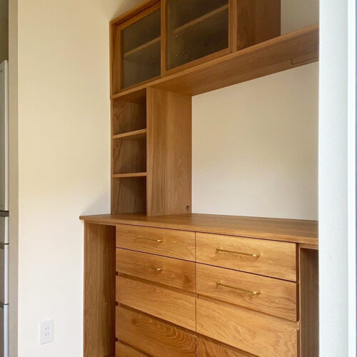 東京のお宅のクリ+着色の食器棚。小棚にスチールの転落防止バー […]