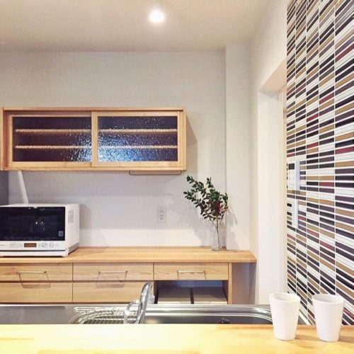 神戸市のお宅の栗の食器棚。 小さめの吊り戸の扉はモザイクガラ […]